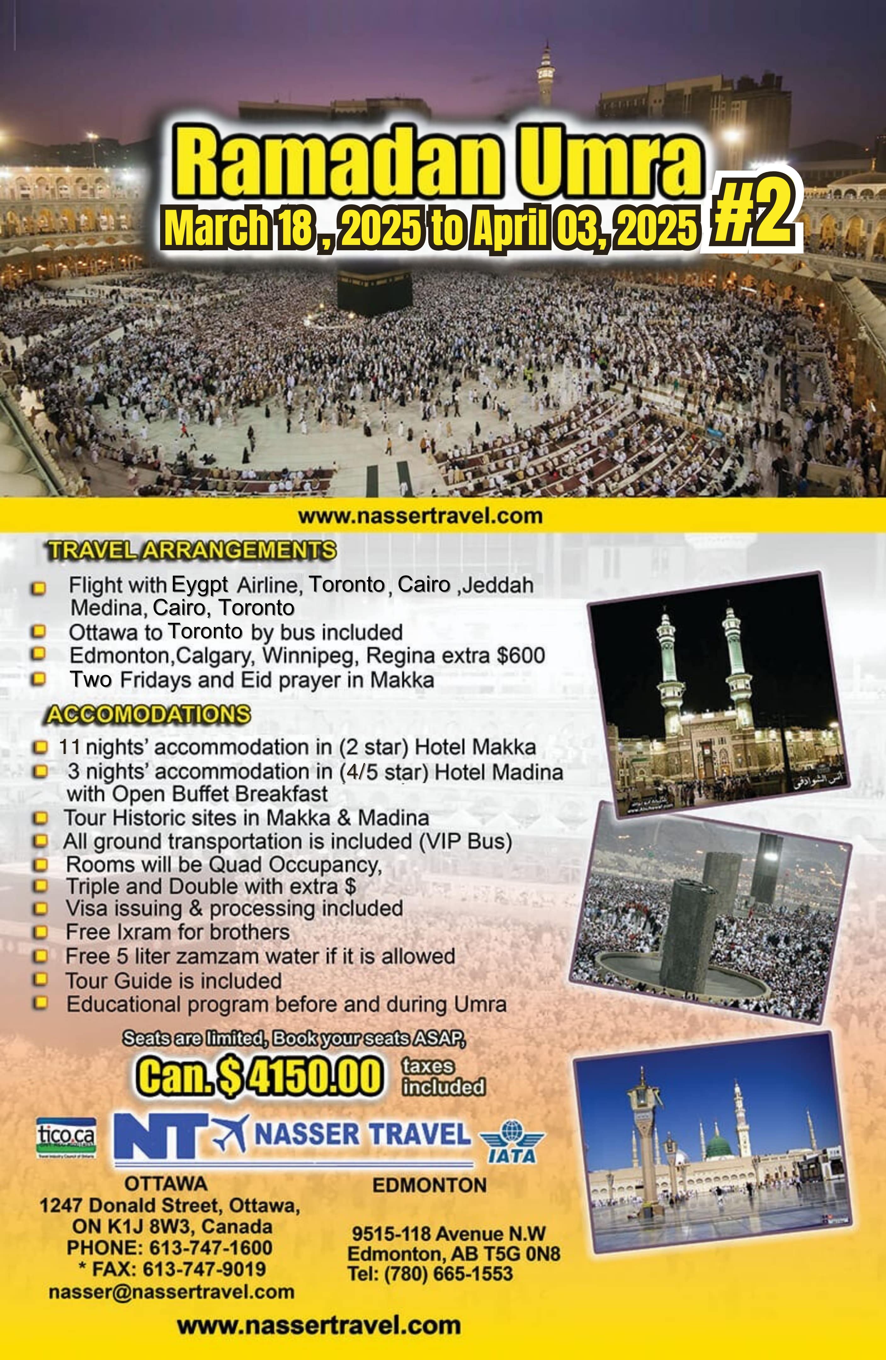 Just like every year we at Nasser Travel would like to announce the opening for the booking for this year's Ramadan Umra Package # 2 2025 and wish everybody GOD's acceptance in this holy trip.