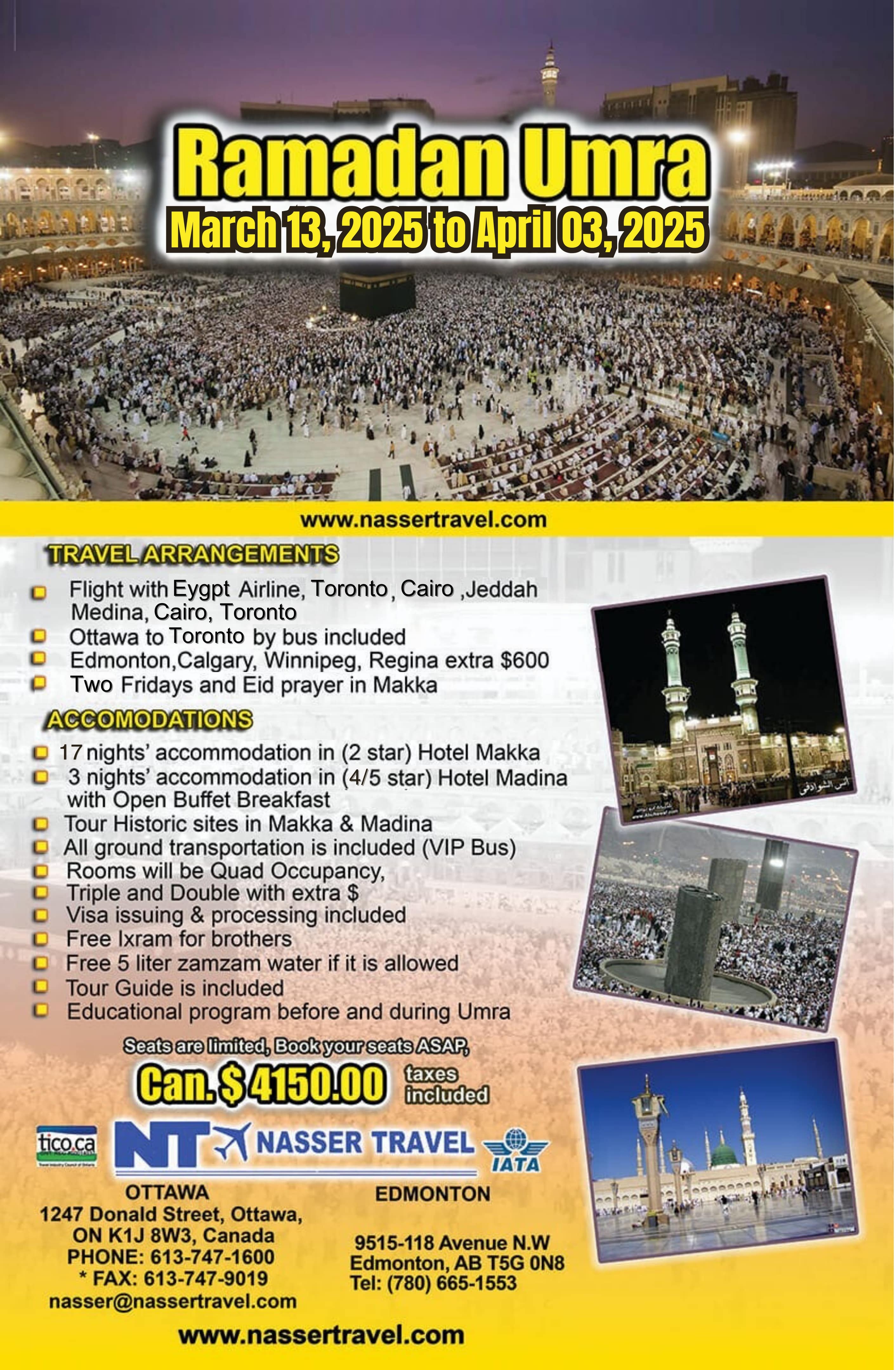 Just like every year we at Nasser Travel would like to announce the opening for the booking for this year's Ramadan Umra Package # 2 2025 and wish everybody GOD's acceptance in this holy trip.