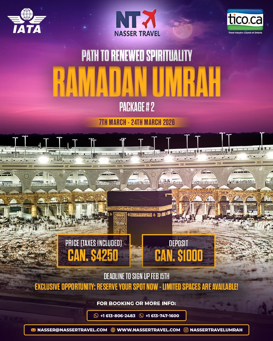 Just like every year we at Nasser Travel would like to announce the opening for the booking for this year's Ramadan Umra Package # 2 2025 and wish everybody GOD's acceptance in this holy trip.